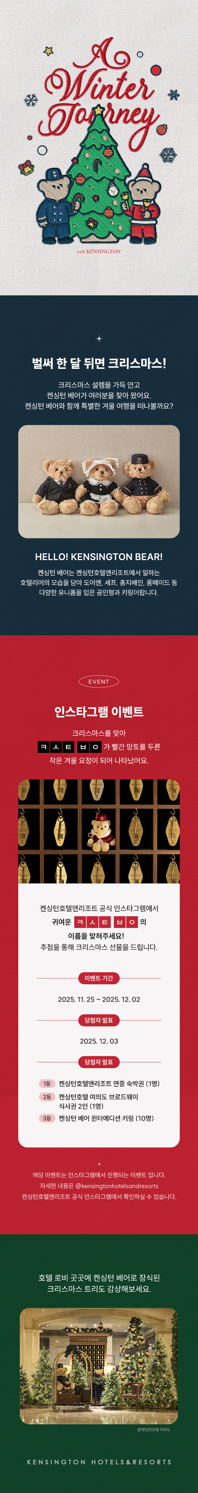 이벤트 켄싱턴 베어 초성퀴즈 이벤트 올 겨울 한정 출시된 'ㅋㅅㅌㅂㅇ' 의 이름을 맞추고 여행을 떠나보세요. 이벤트 기간 2025. 11. 25 ~ 2025. 12. 02 켄싱턴 베어 초성퀴즈 이벤트 바로가기 목록 SNS 공유하기 블로그 카카오페이지 페이스북 URL 복사